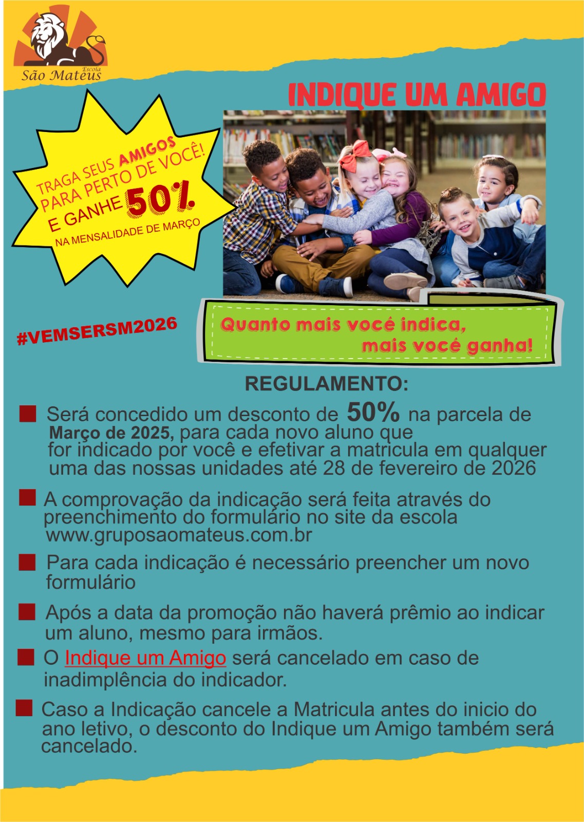 “Nosso Colégio tem uma proposta clara e focada nos princípios de Seriedade, Competência, Consciência e Dedicação, que são vivenciados pelo aluno no dia a dia escolar. Projetos Pedagógicos consistentes e atualizados tem como fundamento desenvolver o senso crítico, a curiosidade, a criatividade, a solidariedade, o respeito, a responsabilidade e a expressão de ideias, respeitando cada faixa etária.O Grupo São Mateus acredita que pode ajudar a melhorar a vida de cada um. E melhorar o mundo para todos.”